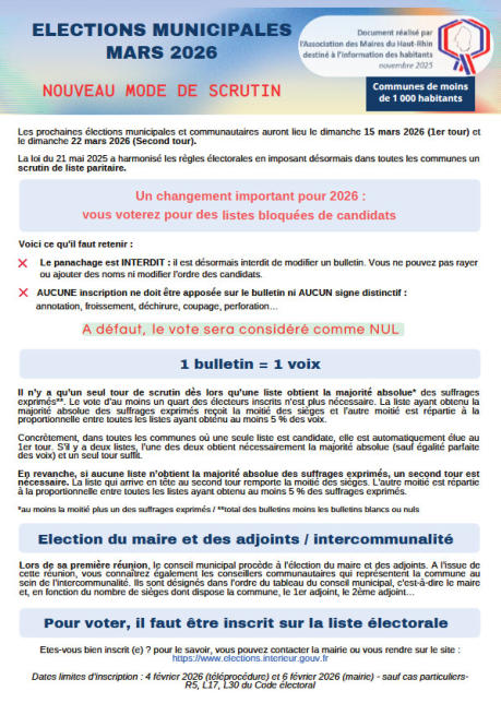 La loi du 21 mai 2025 a harmonisé les règles électorales et instaure désormais, pour toutes les communes, un scrutin de liste paritaire. Ce changement modifie plusieurs habitudes de vote, en particulier le panachage qui n’est désormais plus autorisé. Vous trouverez ci-contre un document d’explication.